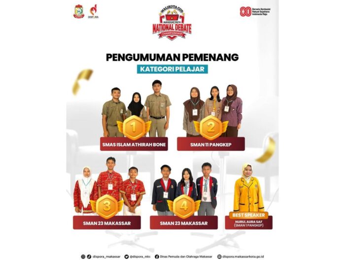 RETAS.News MAKASSAR – Kompetisi bergengsi Walikota Cup Makassar Youth National Debate Championship 2025 resmi berakhir dengan sukses. Bertempat di Mall Pipo Makassar, Jalan Metro Tanjung Bunga, pada Minggu (10/8/25), ajang yang digagas oleh Dinas Pemuda dan Olahraga (Dispora) Kota Makassar ini menobatkan SMAS Islam Athirah Bone sebagai juara pertama, sekaligus berhak membawa pulang piala bergilir Walikota Makassar.