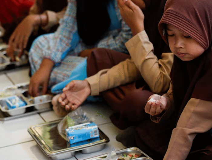 Sumber Foto : abc.net/Willy Kurniawan-Anak-anak sedang menyantap menu makanan harian yang disediakan melalui program MBG.